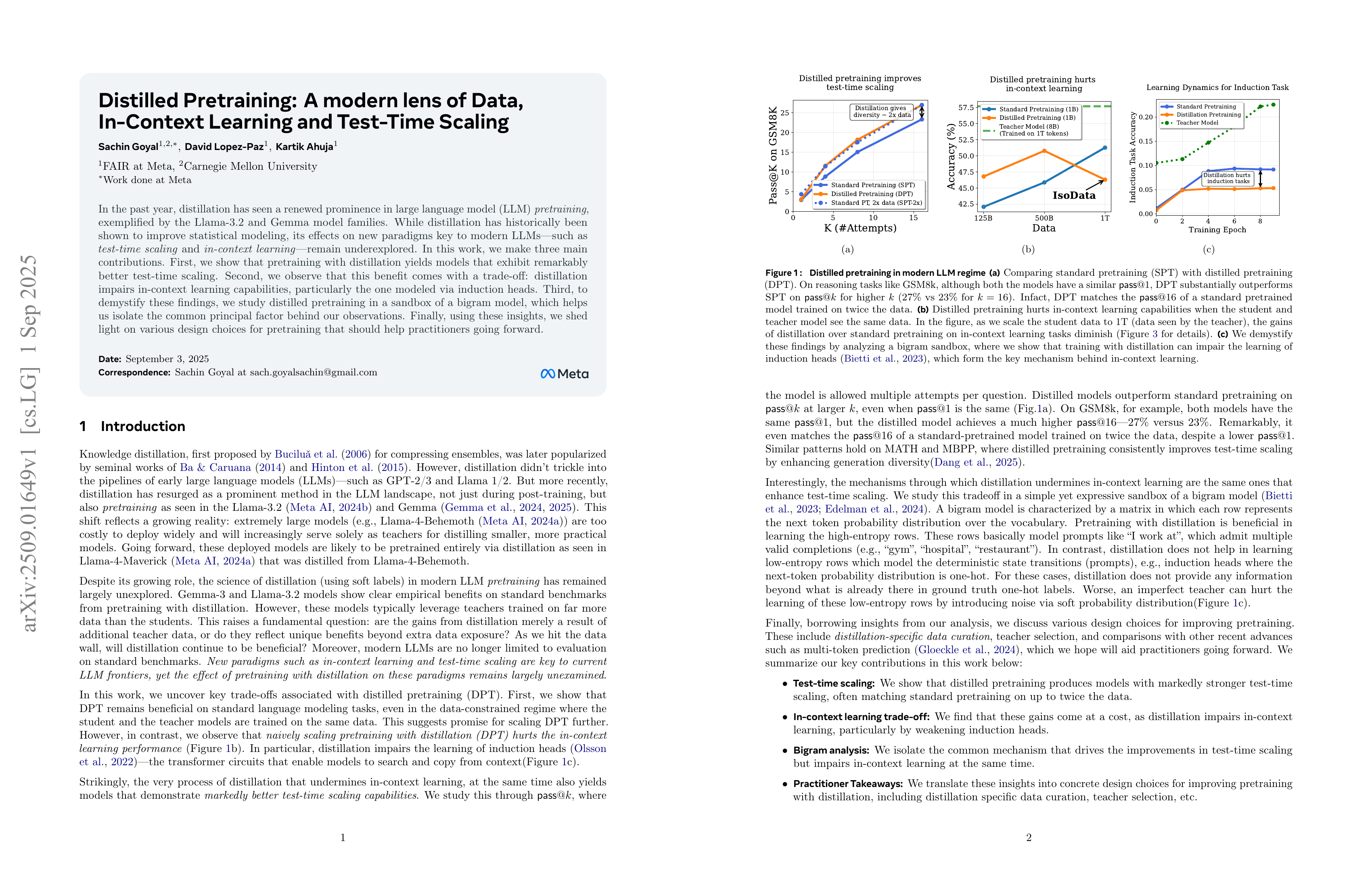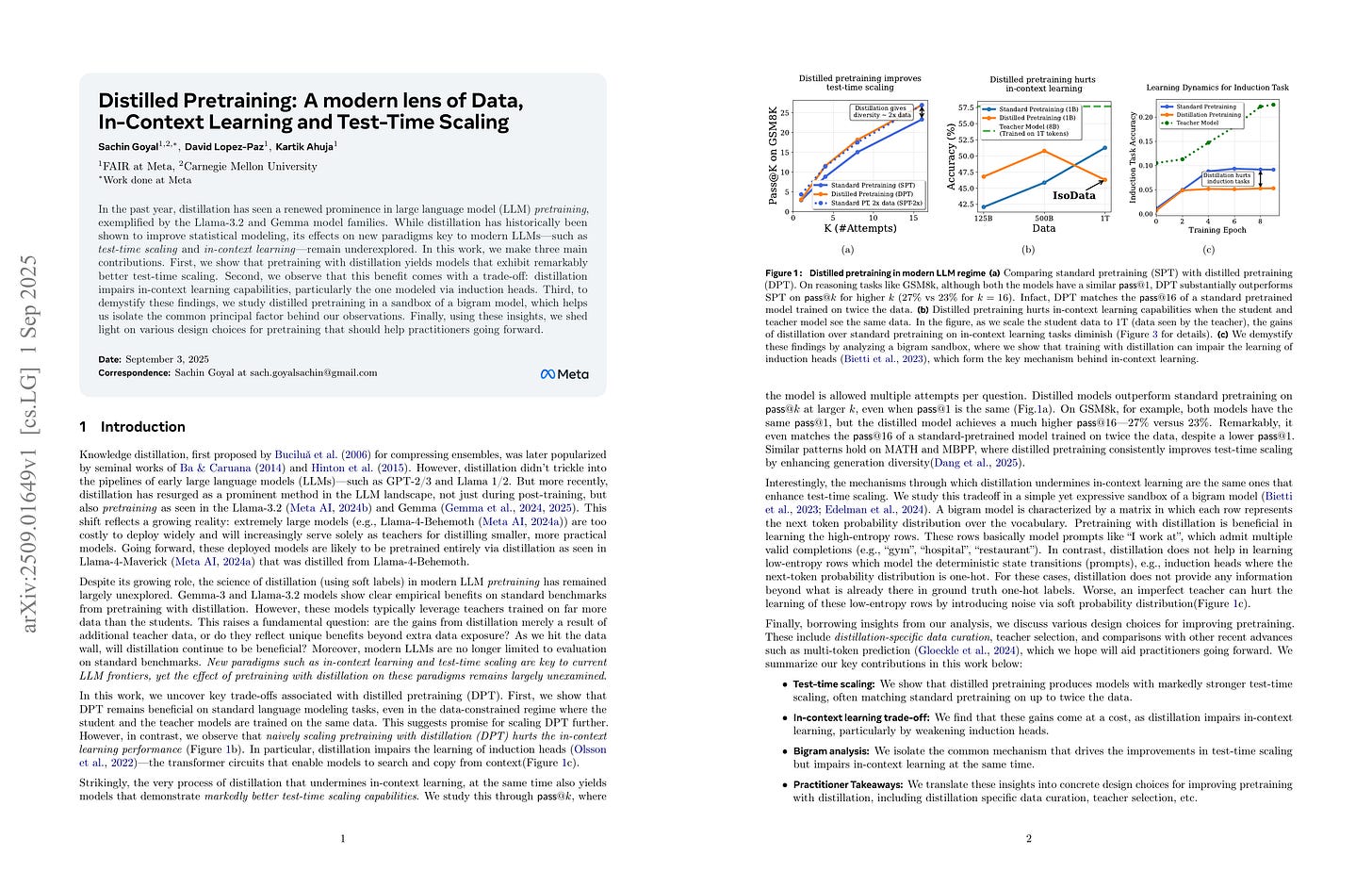 Analysis of distillation during pretraining. It enhances diversity but hurts in-context learning (potentially because it introduces noise when data entropy is low). This paper also shows how to address this and finds that RL-trained models could serve as better teachers.