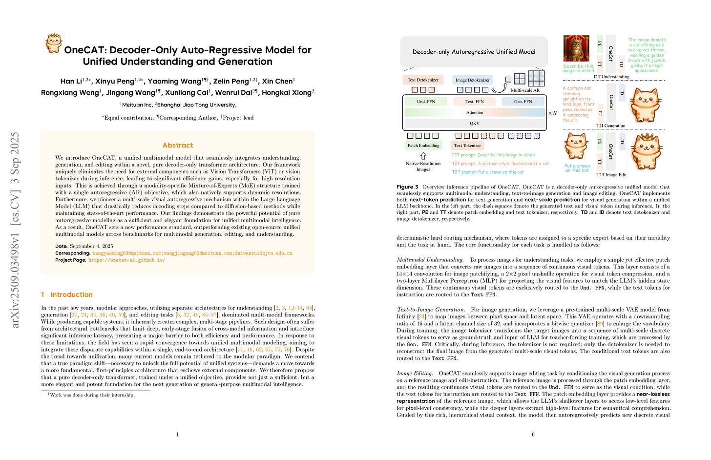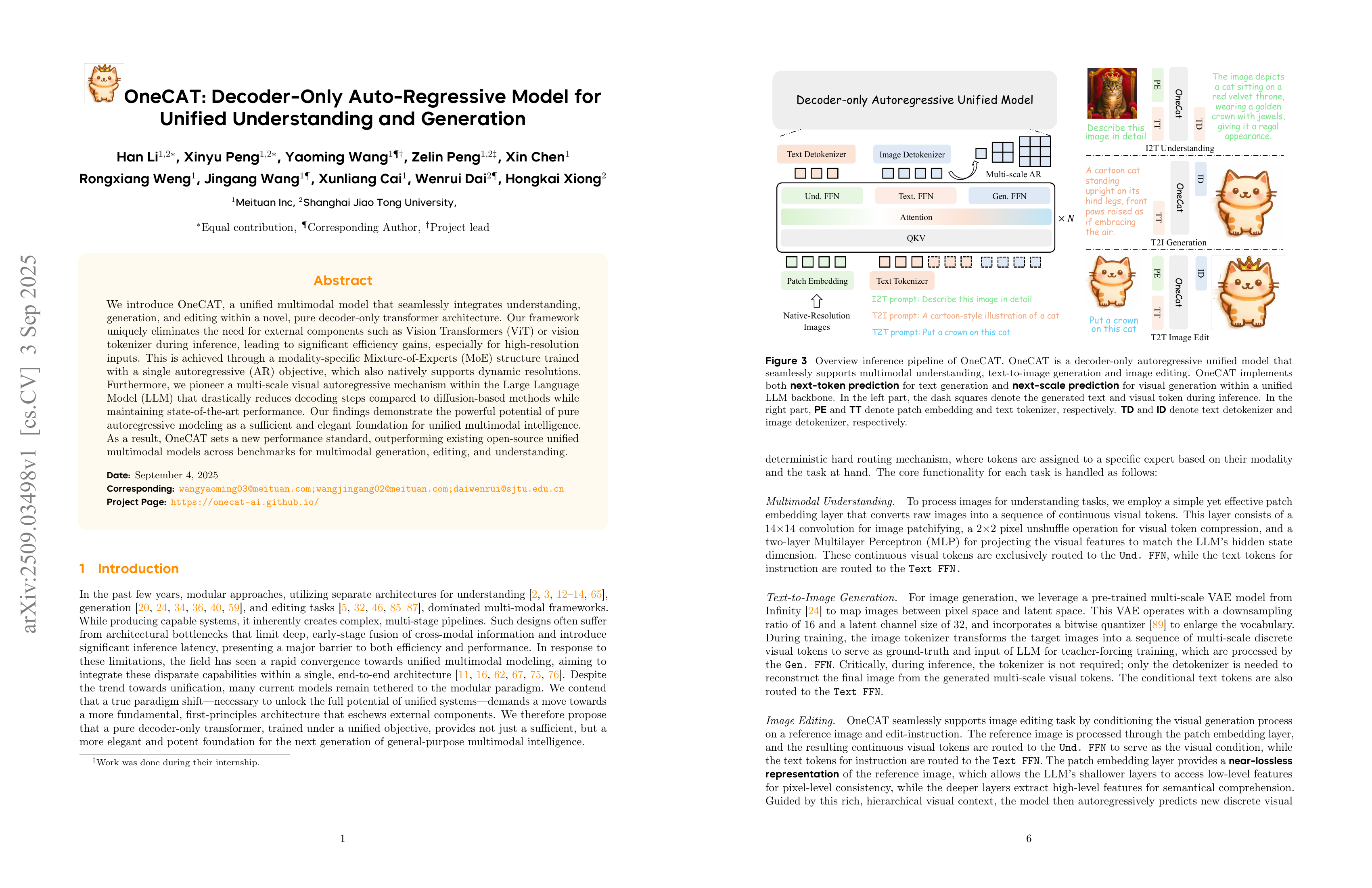 We introduce OneCAT, a unified multimodal model that seamlessly integrates understanding, generation, and editing within a novel, pure decoder-only transformer architecture. Our framework uniquely eliminates the need for external components such as Vision Transformers (ViT) or vision tokenizer during inference, leading to significant efficiency gains, especially for high-resolution inputs. This is achieved through a modality-specific Mixture-of-Experts (MoE) structure trained with a single autoregressive (AR) objective, which also natively supports dynamic resolutions. Furthermore, we pioneer a multi-scale visual autoregressive mechanism within the Large Language Model (LLM) that drastically reduces decoding steps compared to diffusion-based methods while maintaining state-of-the-art performance. Our findings demonstrate the powerful potential of pure autoregressive modeling as a sufficient and elegant foundation for unified multimodal intelligence. As a result, OneCAT sets a new performance standard, outperforming existing open-source unified multimodal models across benchmarks for multimodal generation, editing, and understanding.