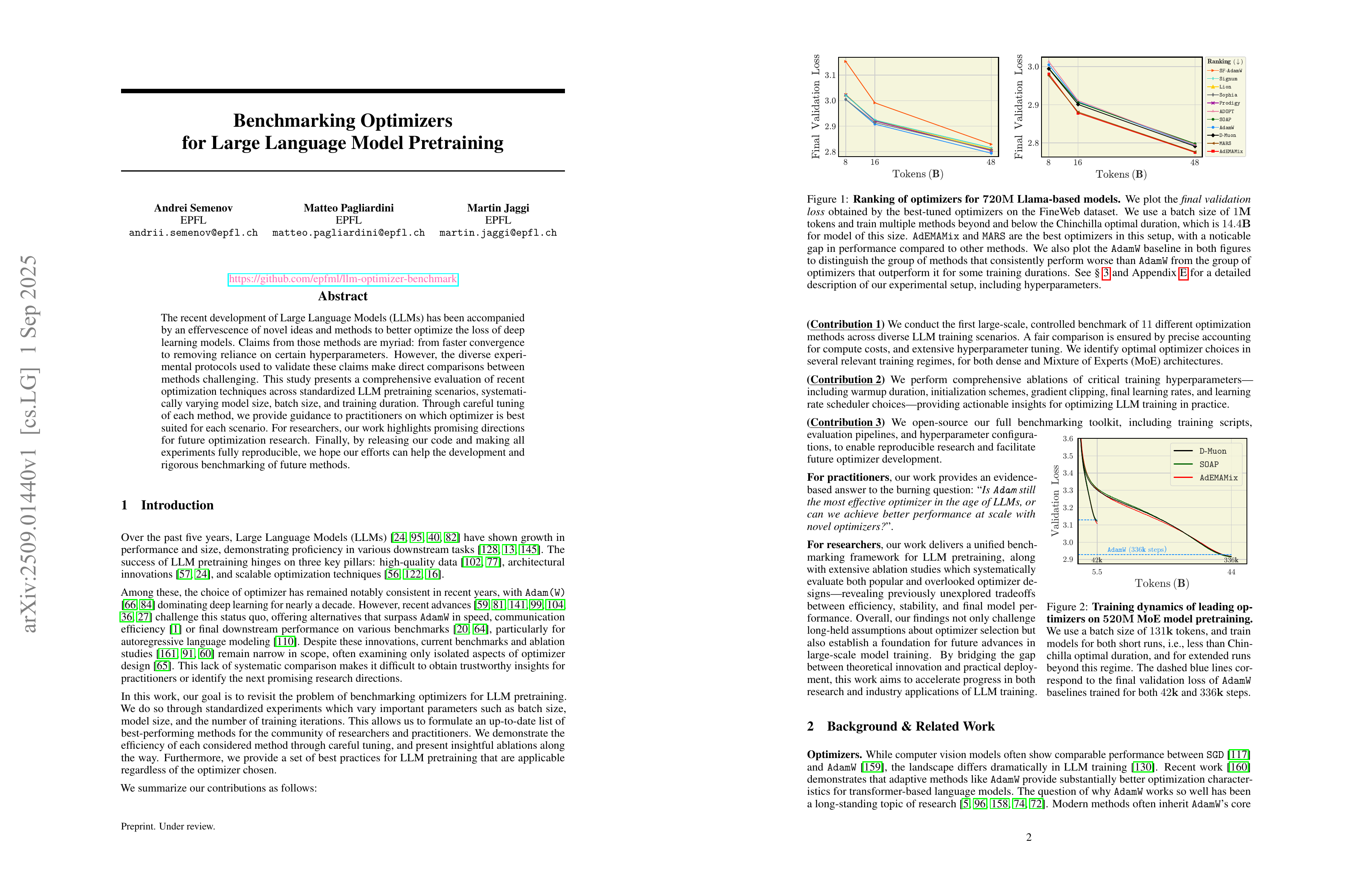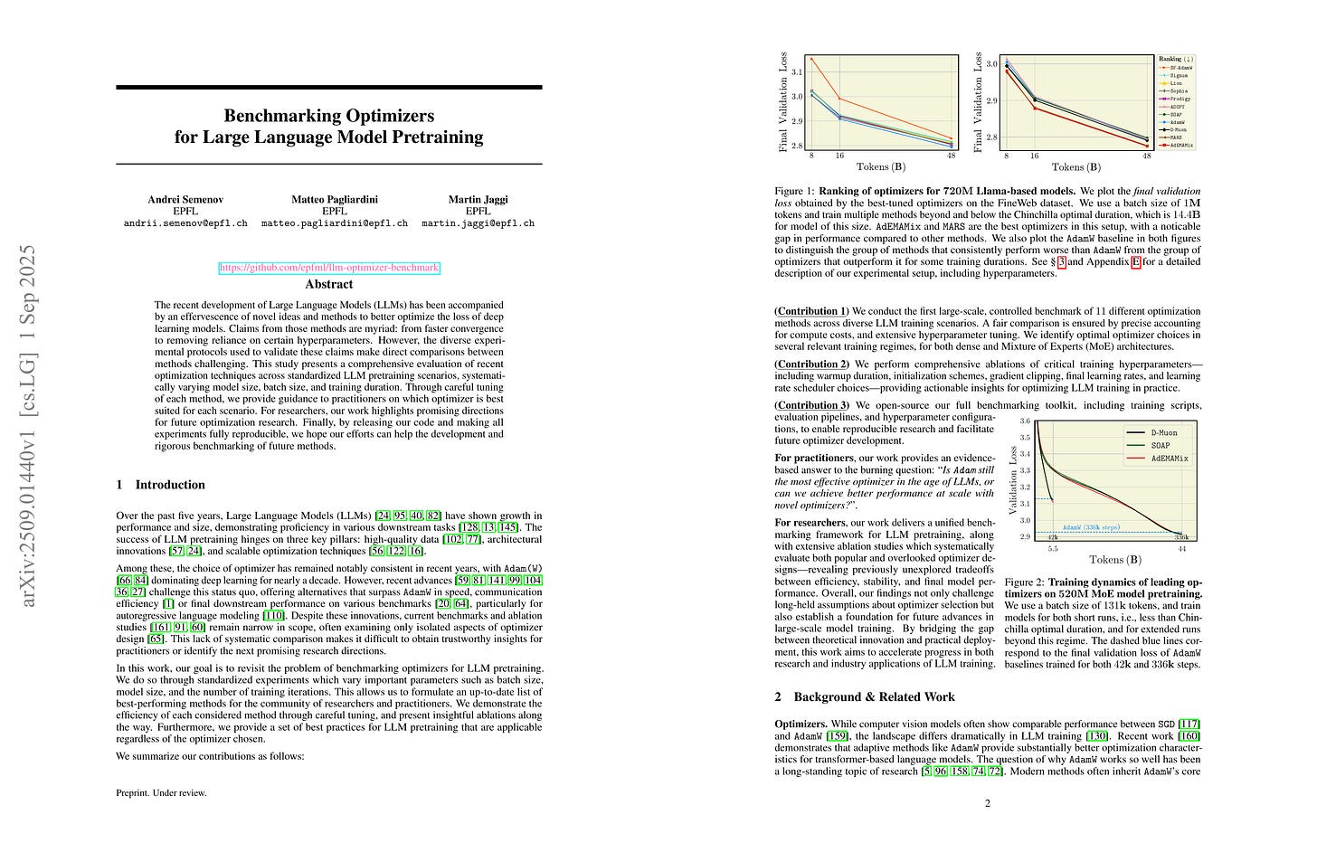 Optimizer benchmarks 1. AdEMAMix is interesting. (It has been used in a recent model, https://github.com/swiss-ai/apertus-tech-report/blob/main/Apertus_Tech_Report.pdf) There are promising optimizers. How would they compare in token efficiency?